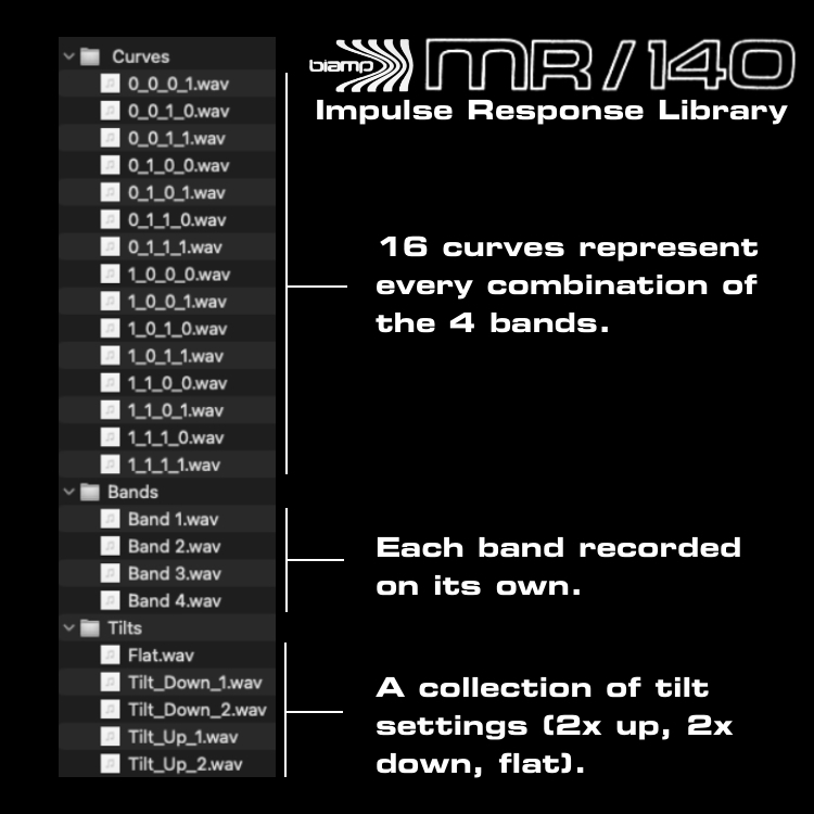 This library includes 24 impulse responses as 24-bit .wavs, organized and named clearly in groups that represent a collection of useful front panel settings.